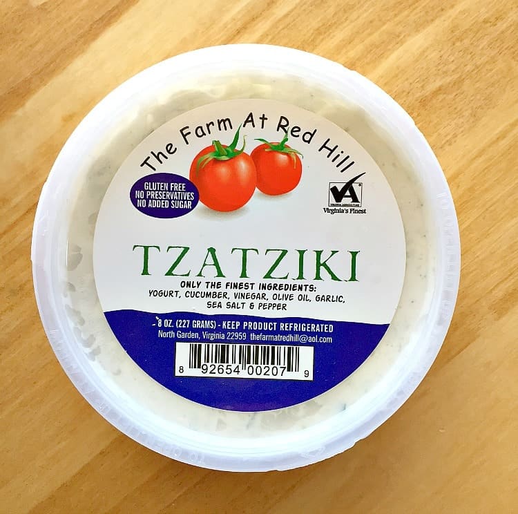 which I served with feta cheese, sliced cucumber and tomato, red onion, olives, this Tzatziki sauce that I picked up at Total Foods,